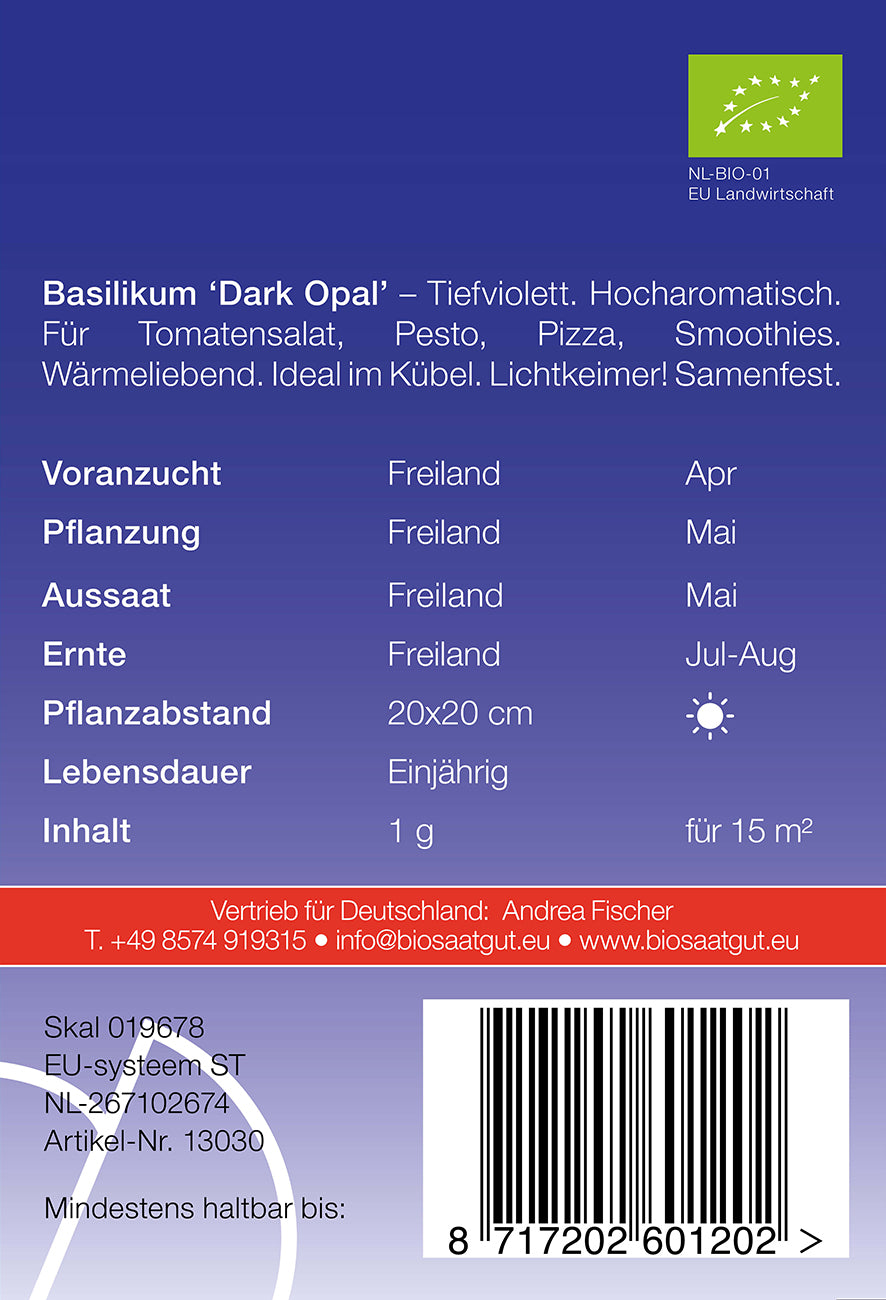 Tiefviolett. Hocharomatisch. Für Tomatensalat, Pesto, Pizza, Smoothies. Wärmeliebend. Ideal im Kübel. Lichtkeimer. Samenfest.