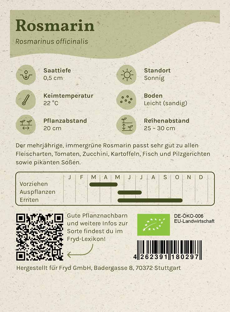 Der mehrjährige, immergrüne Rosmarin passt sehr gut zu allen Fleischarten, Tomaten, Zucchini, Kartoffeln, Fisch und Pilzgerichten sowie pikanten Soßen.