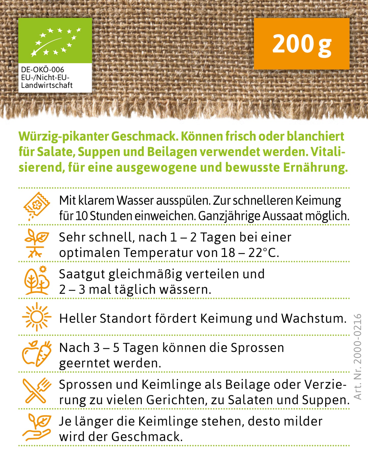 Würzig-pikanter Geschmack. Können frisch oder blanchiert für Salate, Suppen und Beilagen verwendet werden. Vitalisierend, für eine ausgewogene und bewusste Ernährung.