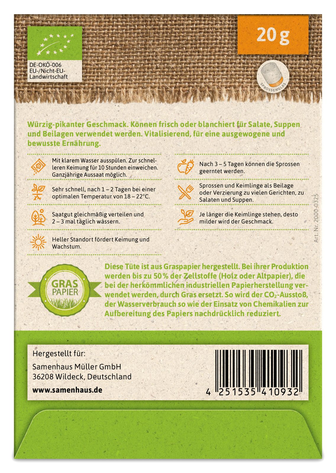 Mit klarem Wasser aus spülen. Zur schnelleren Keimung für 10 Stunden einweichen. Ganzjährige Aussaat möglich.