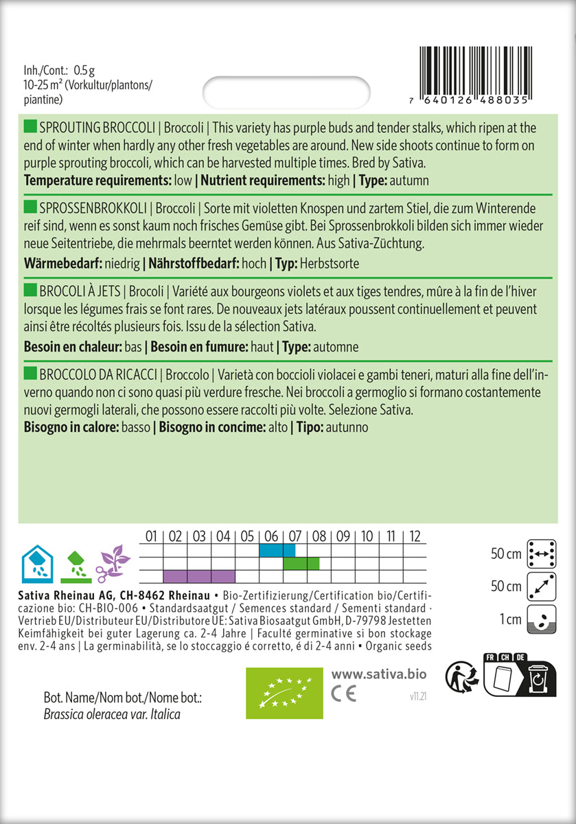 Sorte mit violetten Knospen und zartem Stiel, die zum Winterende reif sind, wenn es sonst kaum noch frisches Gemüse gibt. Bei Sprossenbrokkoli bilden sich immer wieder neue Seitentriebe, die mehrmals beerntet werden können. Aus Sativa-Züchtung.